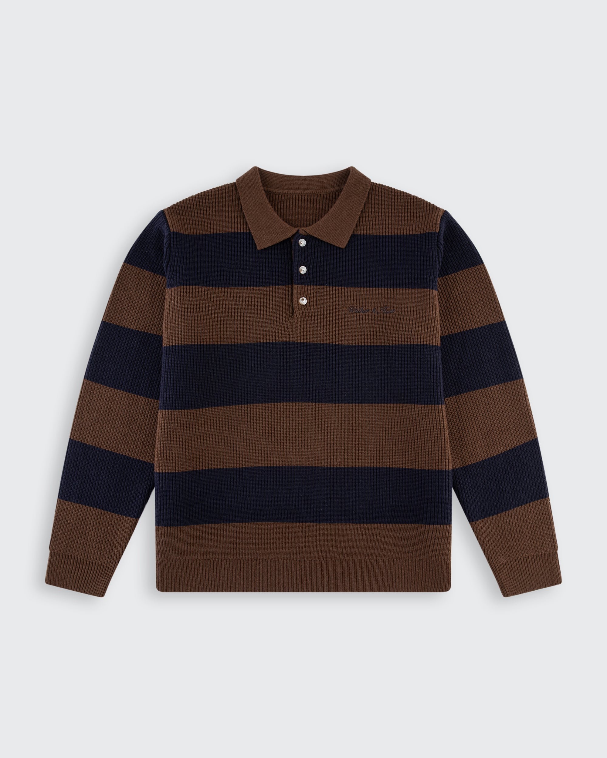 Rugged stripes. Refined edge. The Brown & Navy Lando Knit brings classic sport style with a bold twist. Made from textured knit fabric and finished with wide horizontal stripes, it’s built for cool days, casual hangs, and confident layering.