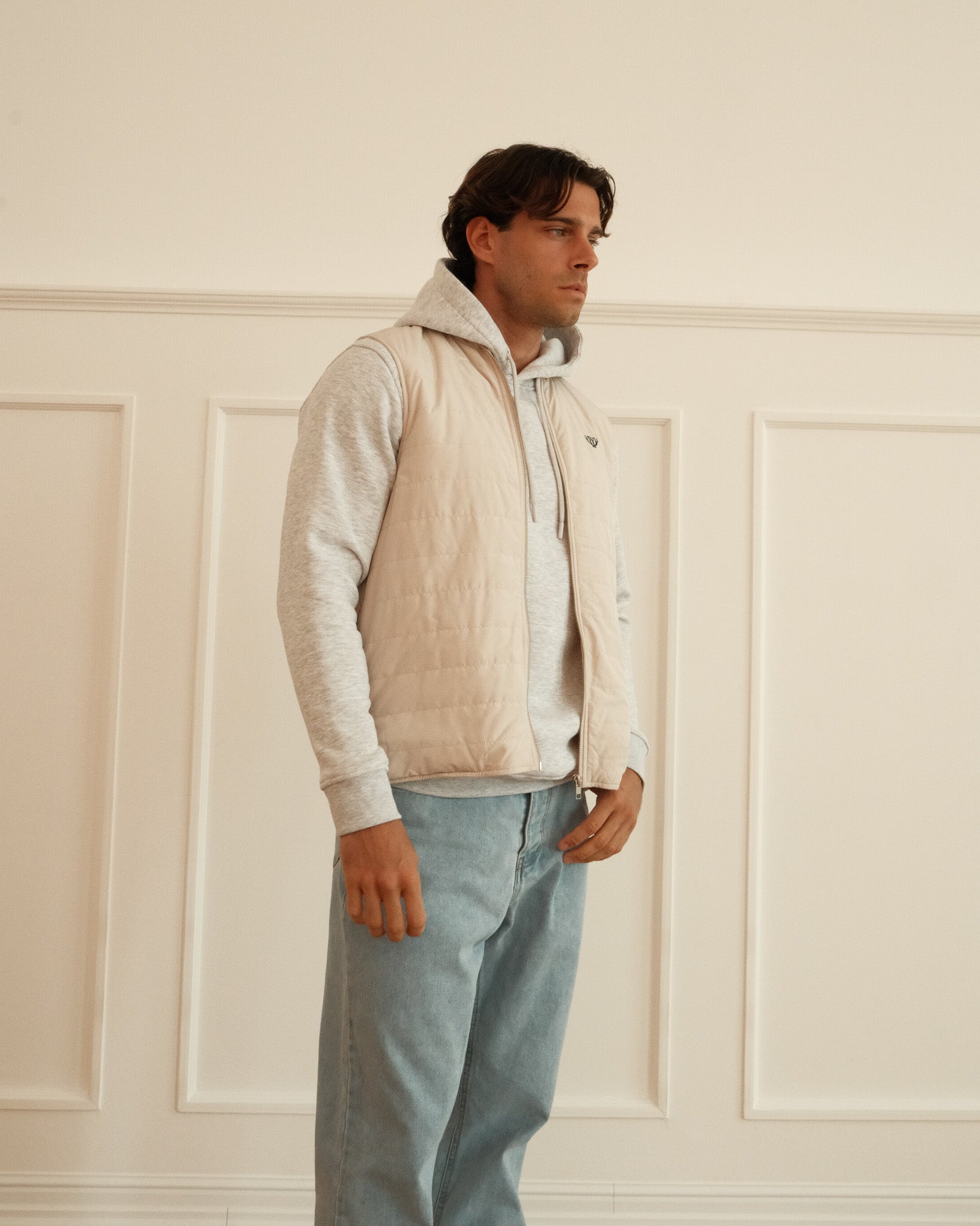 The Beige Gilet delivers the perfect blend of comfort and versatility with its soft padded design and minimalist silhouette. Wear it over hoodies, tees, or long sleeves for an upgraded, modern look without the bulk. Finished with premium embroidery for a refined touch.